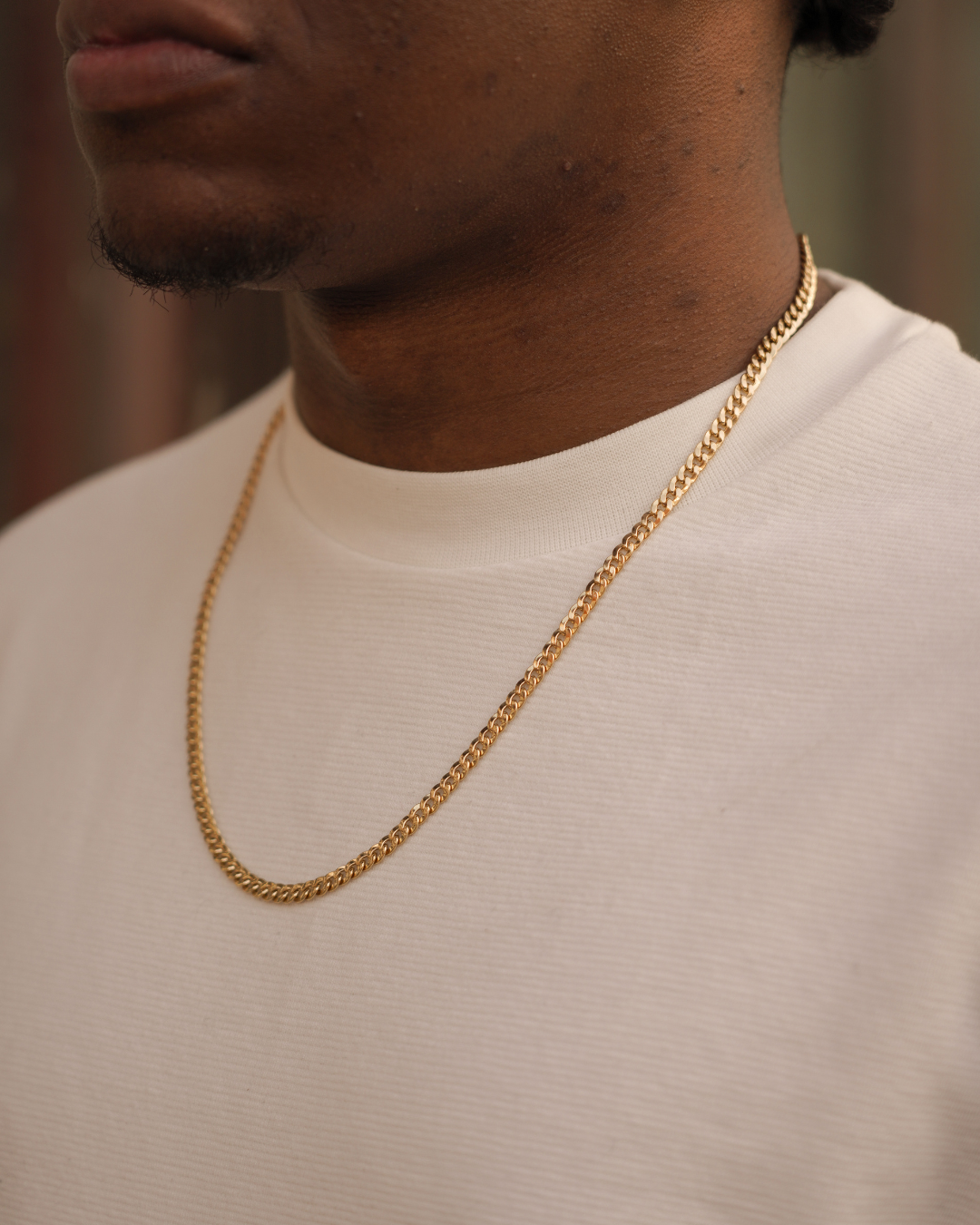 La cadena cubana Miami, ofrece un diseño refinado con eslabones anchos y perfilados, que combina resistencia y estilo contemporáneo. Este modelo destaca por su acabado pulido, que realza su presencia y versatilidad, ideal para quienes buscan una pieza emblemática que aporte un carácter distintivo y sofisticado a cualquier atuendo.